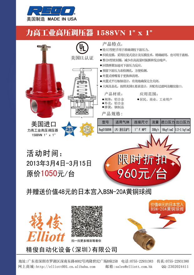 最新公告:恭祝各位在新的一年事业长虹,为答谢客户的支持,我们精俊自动化设备(深圳)公司特推出调压器rego1588vn买一送一黄铜球阀活动,请登录http://elliott001.cn.alibaba.com或直拨0755-22931381