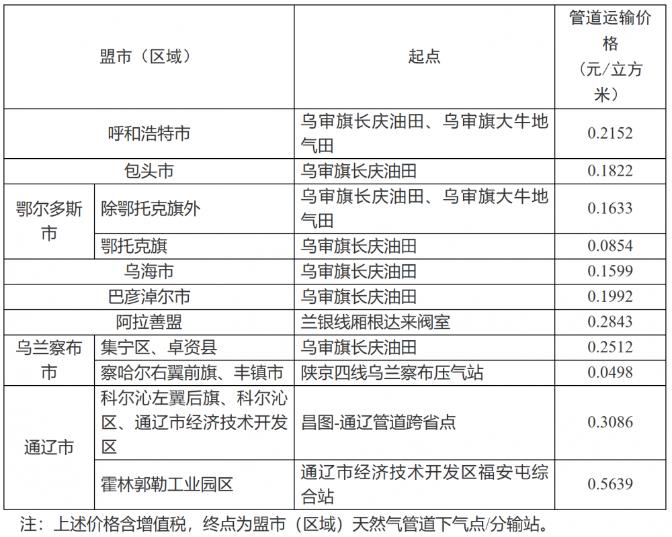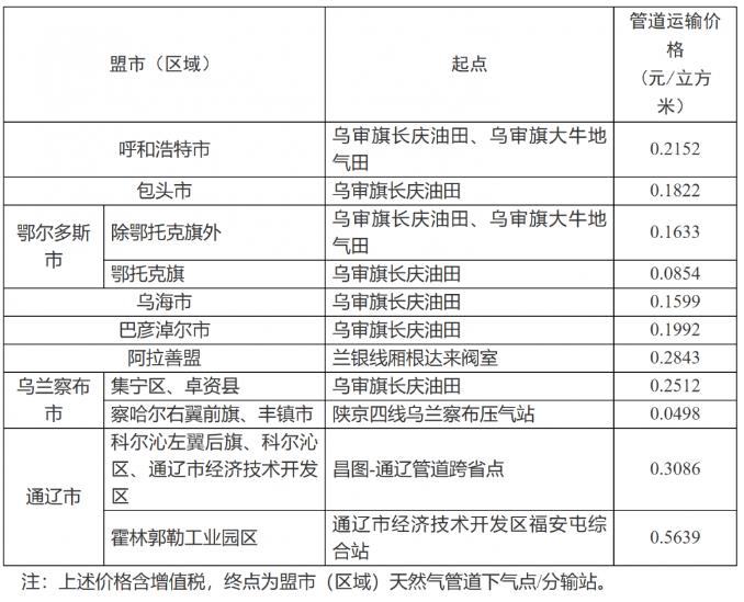 内蒙古自治区天然气管道运输价格表