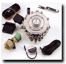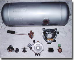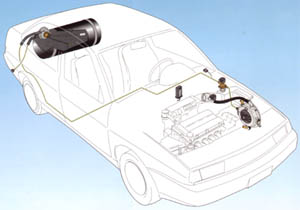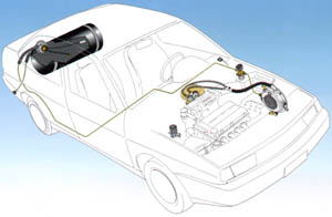 | 贮罐中的LPG以液态形式经过组合阀流向发动机(该组合阀通过外部加气阀也可用于LPG加气)。联接发动机和贮罐的管线上装有电磁阀,只有当发动机处于运行状态且油气转换开关位于气体位置时,该电磁阀开启。发动机装有减压装置,液态LPG进入后不断减压变为气态。减压后的气态LPG进入装在进气管上的空气/燃气混合器,该混合器根据发动机的需要(表现为混合装置中产生的真空度)计量气量。 096型开关/表盘除其他作用以外,还保证以汽油起动并自动转换为燃气,该转换通过汽油起动电磁阀完成,驾驶员可根据LPG液位显示,随时选择燃料。 在以气为燃料时,电子仿真装置截断发动机的油料供应,而当燃油时,LPG电磁阀关闭,截断LPG供给。 |