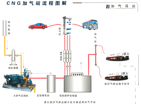 CNG加气母站除具有标准站的功能外,还通过设在站内的加气术将压缩天然气充入高压气体运输半挂车(简称半挂车),运到加气子站为汽车加气。同时,作为管道输气的有效补充手段,在距天然气管线较远的中小城市,可采用半挂车将压缩天然气通过公路运输方式运送至使用城市,经过调压后进入燃气管网,向居民用户及其它天然气用户供气。