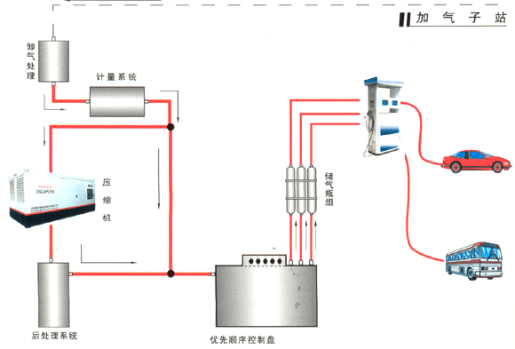 标准站直接从燃气管网取气,经过预处理系统、压缩、储存等一系列工艺后,通过售气机给汽车加气。