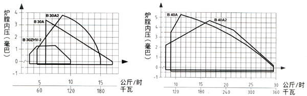· 燃烧机的耗油量和输出范围受炉膛内压影响,请参看下面的[炉膛内压/输出功率图表]。 |
