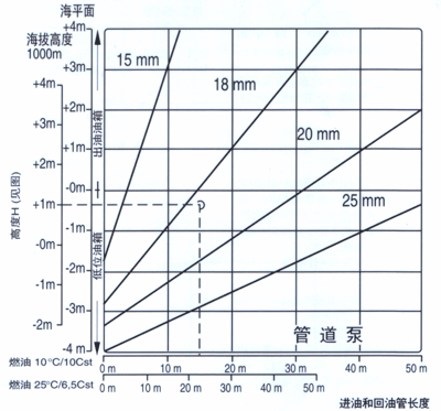 ★ 直接进油:根据长度L和进油高度H选择相应的管路。长度L包括一个手阀,一个单向阀和四个弯头。
