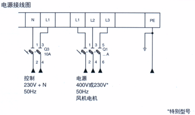 电源接至端子N(中线)和L1(相线)之间,这安全起见,当使用230V三相电源时,如果没有中线或中线有阻抗,必须使用绝缘变压器和30mA的差动电路断路器。