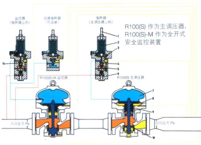 ● R1OO(S)-M监控器的工作原理与标准型R100(S)调压器相似。在正常工作条件下,由于监控器比调压器的压力设定值高,所以监控器的阀芯处于完全打开状态(指挥器闷芯(11)保持全开)。当主调压器发生故障时,主调压器的阀芯自动打开,出口压力逐渐增大。当达到监控器的设定压力值时,监控器立即进入工作状态。指挥器的阀芯(11)关闭,气室中气体临时流向出口.使监控器的开度减小,出口压力随之降低。