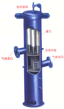 过滤分离器为两段式结构,第一段使用具有过滤-聚结功能的PEACH滤芯,当气体由外向内通过滤芯时,固体被分离,液体微粒聚结成较大的液滴后被除数带到第二段内,由分离挡板分离出。分离出的液体聚集散在筒体下部或积液包内。